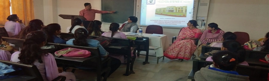 लाडनूँ, 15 मार्च 2019। जैन विश्वभारती संस्थान (मान्य विश्वविद्यालय) के आचार्य कालू कन्या महाविद्यालय में ‘‘भारत में कराधान’’ विषय पर एक दिवसीय कार्यशाला का आयोजन किया गया। कार्यशाला के उद्घाटन सत्र में मुख्य वक्ता विषय-विशेषज्ञ नीतेश माथुर सीए ने देश में प्रचलित कर प्रणाली के बारे में जानकारी देते हुये देश में लागू की गई एक कर प्रणाली जीएसटी के बारे में विस्तार से बताया। उन्होंने प्रत्यक्ष व अप्रत्यक्ष कर में अंतर बताते हुये माल व सेवा कर के विभिन्न पहलुओं पर प्रकाश डाला व भ्रंतियों का निवारण किया। अध्यक्षता करते हुये प्राचार्य प्रो. आनन्द प्रकाश त्रिपाठी ने अपने सम्बोधन में आम आदमी के जीवन में करों के महत्व के बारे में बताया और आयकर फाईल में आने वाली समस्याओं के बारे में चर्चा की। सहायक आचार्य कमल कुमार मोदी ने कार्यशाला की आवश्यकता को प्रतिपादित करते हुये करारोपण की आवश्यकता और आम आदमी की भूमिका के बारे में बताया। मुख्य वक्ता नीतेश माथुर ने इस अवसर पर छात्राओं की कर समबंधी जिज्ञासाओं का समाधान भी किया। अंत में अपूर्वा घोड़ावत ने आभार ज्ञापित किया। कार्यशाला के द्वितीय सत्र में पत्र वाचन किया गया, जिसमें अवंतिका, रश्मि बोकड़िया, संध्या वर्मा, महिमा प्रजापत व दिशा बैंगानी ने पत्र वाचन किया। सत्र की अध्यक्षता कमल मोदी व सह अध्यक्षता सोनिका जैन ने की। कार्यशाला के समापन सत्र में 7-7 छात्राओं के पांच समूह बनाये जाकर ‘‘भारत में कराधान’’ विषय पर समूह-परिचर्चा का आयोजन किया गया, जिनमें मूल्यांकन कार्य कमल मोदी, सोनिका जैन व अपूर्वा घोड़ावत ने किया।