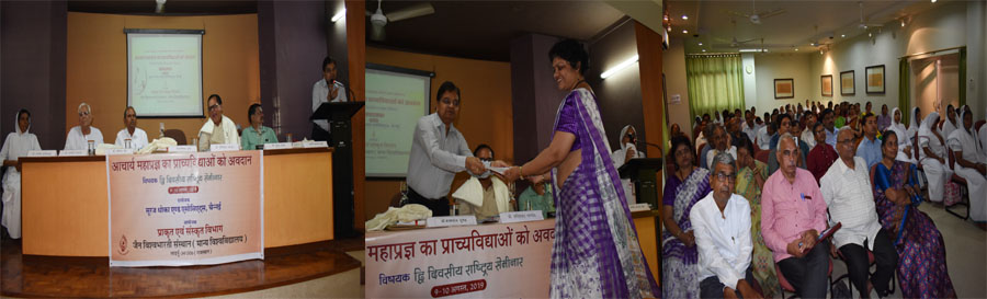 समारोह के मुख्य अतिथि प्रो. धर्मचंद जैन ने कहा है कि आचार्य महाप्रज्ञ ने आगमों का भाष्य किया। उनके आचारांग के भाष्य में जो सूक्ष्म दृष्टि से विवेचना की गई है, वह उनका वैशिष्ट्य था। प्राच्य विद्या में प्राचीन समय में 62 विद्याओं और 84 विद्याओं का क्षेत्र रहा था। प्राच्य विद्या में भारत और पूर्वी देशों की विद्याओं को माना जाता था, लेकिन महाप्रज्ञ की व्यापक दृष्टि थी। उन्होंने पाश्चात्य विद्याओं को भी समझा और उनका विवेचन किया। उन्होंने प्राच्य विद्याओं को नवीन आयाम दिया और शरीर विज्ञान, हार्मोनों की क्रियाओं, प्रेक्षाध्यान से आने वाले परिवर्तनों आदि की बात कही। महाप्रज्ञ ने अनेकांत की परम्परागत परिभाषा से हट कर आधुनिक युग की जीवन शैली से उसको जोड़ा और उसे समयक् दृष्टि के रूप में प्रस्तुत करते हुये जीवन की समस्त समस्याओं के समाधान के रूप में प्रस्तुत किया। विशिष्ट अतिथि प्रो. हरिशंकर पांडेय ने आचार्य महाप्रज्ञ को सामान्य मनुष्य के बजाये साबर तंत्र के आधार पर अदेही गुरू के रूप में अधिक बलवान और समर्थ साबित किया। उन्होंने कहा कि महाप्रज्ञ के एक-एक सूत्र को पकड़ लें तो जीवन को सार्थक बनाया जा सकता है। संगोष्ठी की निदेशिका समणी संगीत प्रज्ञा ने प्रतिवेदन प्रस्तुत करते हुये बताया कि संगोष्ठी में विभिन्न प्रांतों से विद्वानो नें यहां पहुंच कर हिस्सा लिया, जिनमें 17 तो देश के प्रख्यात विद्वान हैं और सभी ने अपने शोध-आलेख प्रस्तुत किये। संस्थान के शोध छात्रों ने भी पत्रवाचन किये। प्रारम्भ में संस्थान के प्राकृत व संस्कृत विभाग के विभागाध्यक्ष प्रो. दामोदर शास्त्री ने अपने स्वागत वक्तव्य में बताया कि महाप्रज्ञ ने आयुर्वेद, अध्यात्म, वेद, विज्ञान आदि सभी पर लिखा है। उन्होंने सबसे महाप्रज्ञ के साहित्य को पढने के लिये प्रेरित किया। इस अवसर पर सभी सम्भागियों को प्रमाण पत्रों का वितरण किया गया। कार्यक्रम का संचालन समणी सम्यकप्रज्ञा ने किया। अंत में डाॅ. योगेश कुमार जैन ने आभार ज्ञापित किया। कार्यक्रम में प्रो. प्रद्युम्न शाह, प्रो. प्रेमसुमन जैन, प्रो. कल्पना जैन, डाॅ. सहदेव शास्त्री, ज्योति बाबू, सुमत जैन, प्रो. अशोक कुमार जैन, डाॅ. मनीषा जैन, डाॅ. आनन्छ जैन, डाॅ. मंजुल प्रज्ञा, डाॅ. समणी अमल प्रज्ञा, डाॅ. पुष्पा मिश्रा, मीनाक्षी मारू, समणी ऋजुप्रज्ञा, प्रो. अनिल धर, प्रो. बीएल जैन, डाॅ. जसबीर सिंह आदि उपस्थित थे।