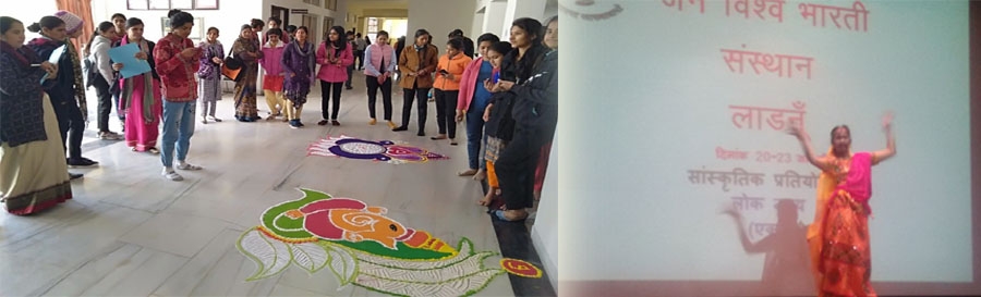 लाडनूँ, 20 जनवरी 2020। जैन विश्वभारती संस्थान (मान्य विश्वविद्यालय) के महाश्रमण ऑडिटोरियम में सांस्कृतिक प्रतियोगिताओं का शुभारम्भ प्रो. समणी ऋजुप्रज्ञा की अध्यक्षता में किया गया। शिक्षा विभाग के विभागाध्यक्ष प्रो. बीएल जैन भी कार्यक्रम के मंचासीन अतिथि रहे। सांस्कृतिक प्रतियोगिताओं के प्रथम दिवस रंगोली प्रतियोगिता एवं एकल लोकनृत्य प्रतियोगिताओं का आयोजन किया गया। रंगोली प्रतियोगिता के लिये छात्राओं के 39 समूह बनाये गये, जिन्होंने परिसर में ही विभिन्न आकर्षक रंग उकेरते हुये मनभावन रंगोलियां सजाई। रंगोलियों में विजेताओं के चयन के लिये डाॅ. सुनिता इंदौरिया व डाॅ. ममता सोनी ने निर्णायक की भूमिका निभाई और सभी रंगोलियों का अवलोकन किया। इसके अलावा एकल लोकनृत्य प्रतियोगिता में 52 प्रतिभागियों ने राजस्थानी लोकगीतों पर एक से बढ कर ऐ लोक नृत्यों की प्रस्तुतियां दी। इनके निर्णायकों के रूप में डाॅ. तृप्ति त्रिपाठी और अंजलि माथुर उपस्थित रही। प्रतियोगिताओं का शुभारम्भ सरस्वती के पूजन के साथ किया गया। प्रारम्भ में सांस्कृतिक समिति की सचिव डाॅ. अमिता जैन ने प्रतियोगिता के उद्देश्यों पर प्रकाश डाला और अतिथियों का परिचय प्रस्तुत किया। कार्यक्रम का संचालन डाॅ. विनोद कस्वा ने किया।